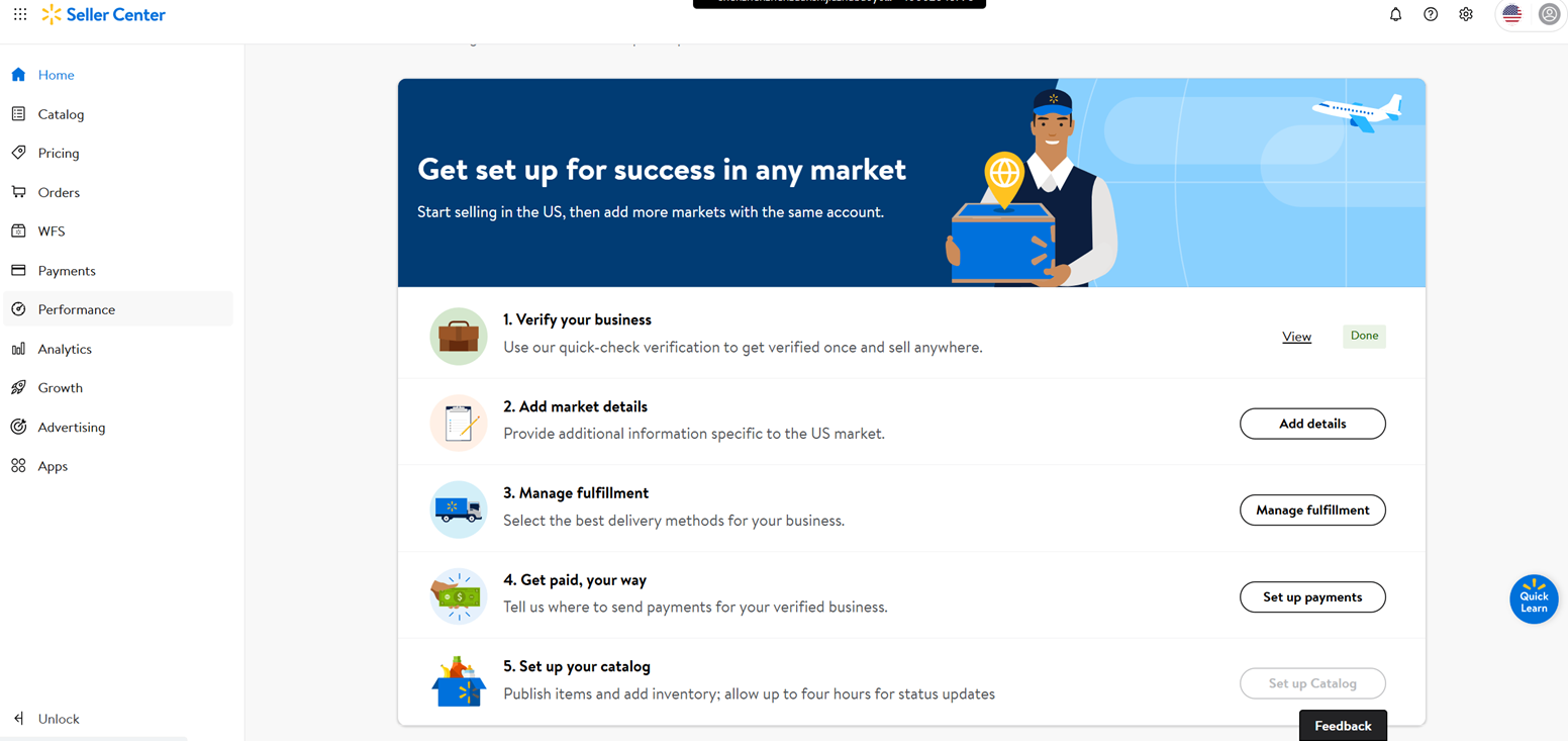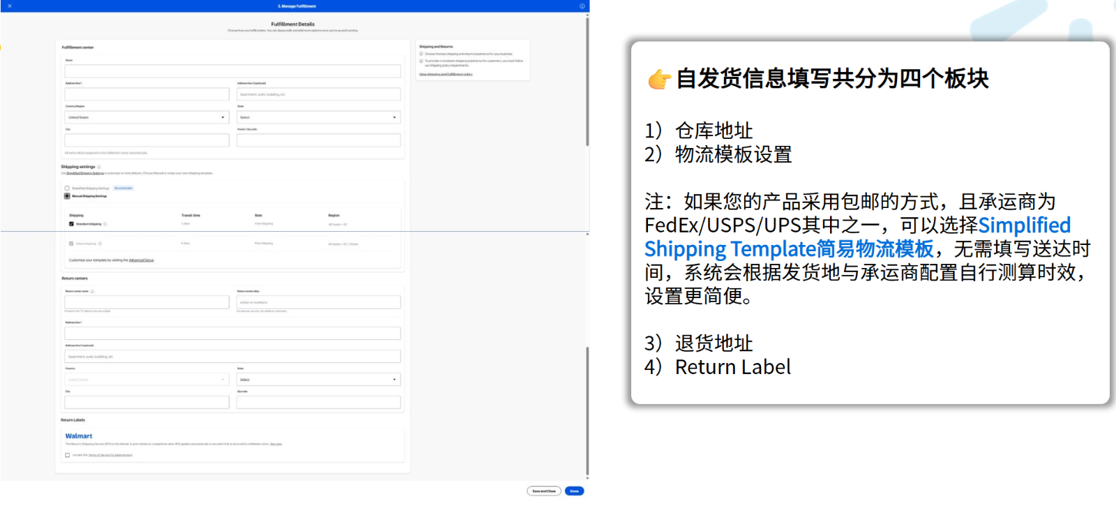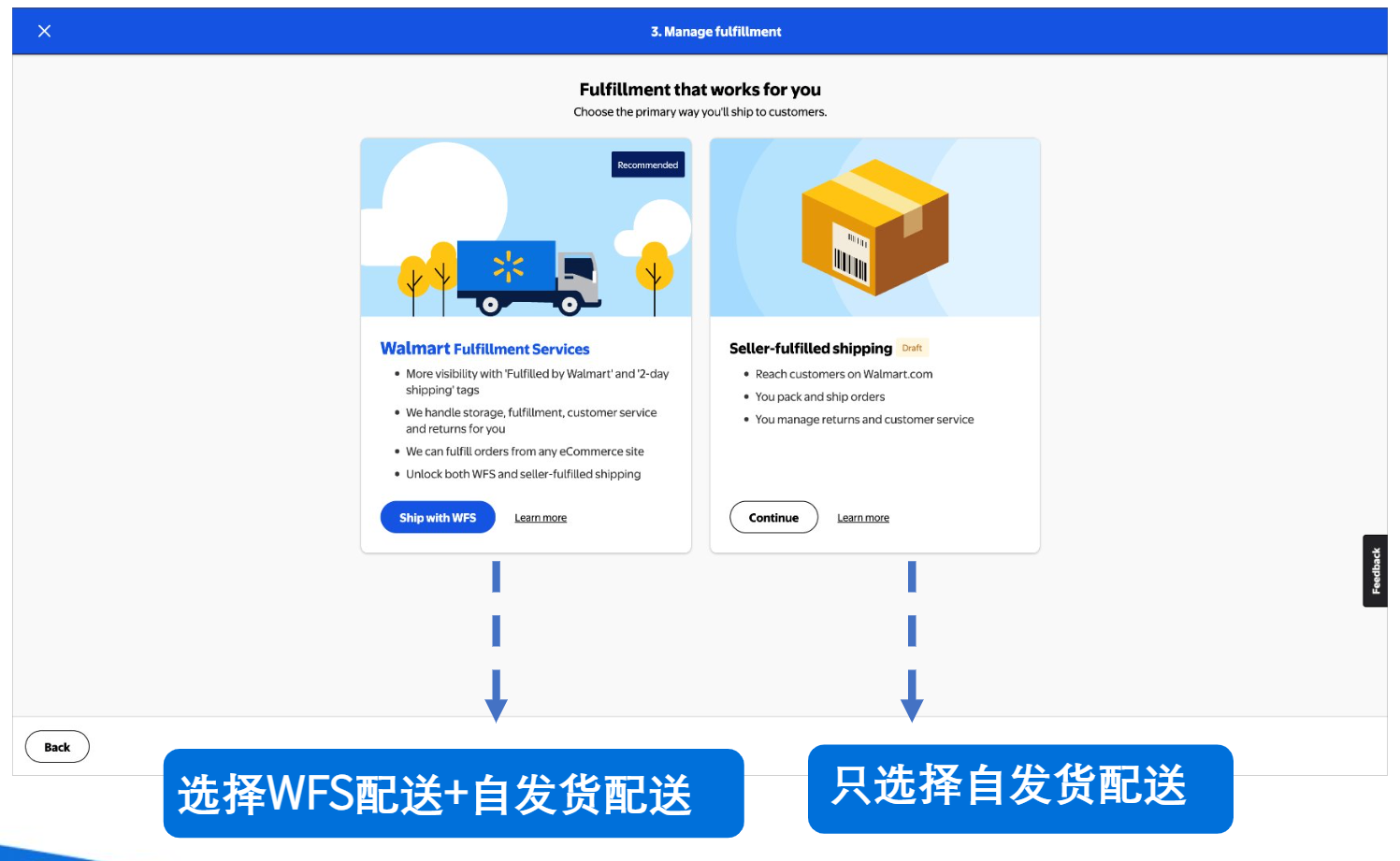 进入物流设置界面后,卖家可以选择沃尔玛官方仓储配送服务(WFS)与自发货配送结合,或只进行自发货两种物流方式。