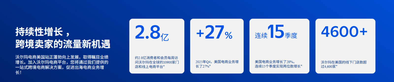 与沃尔玛同行,就是与增长同行。2026年的大门已经开启,$75,000的福利窗口期稍纵即逝。无论您是拥有雄厚实力的大品牌,还是蓄势待发的工厂型卖家,现在都是入驻沃尔玛的理想时机。因为选择沃尔玛就是选择了一个值得信赖的、高质量增长平台,官方团队将全程相伴,提供从入驻到运营的一站式专属服务,更有强力福利助力卖家快速实现销售增长。