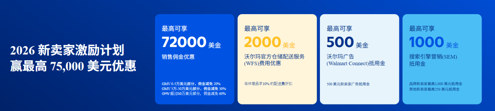针对2026年2月1日之后入驻的新卖家,平台准备了累计最高可达75,000美元的激励大礼包。这份礼包精准覆盖了卖家成长的关键成本项: