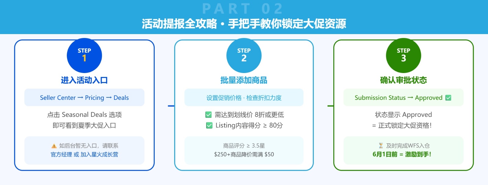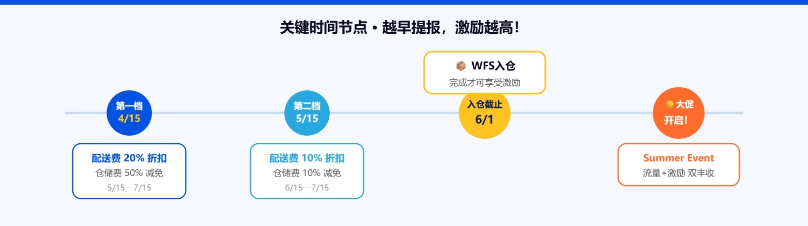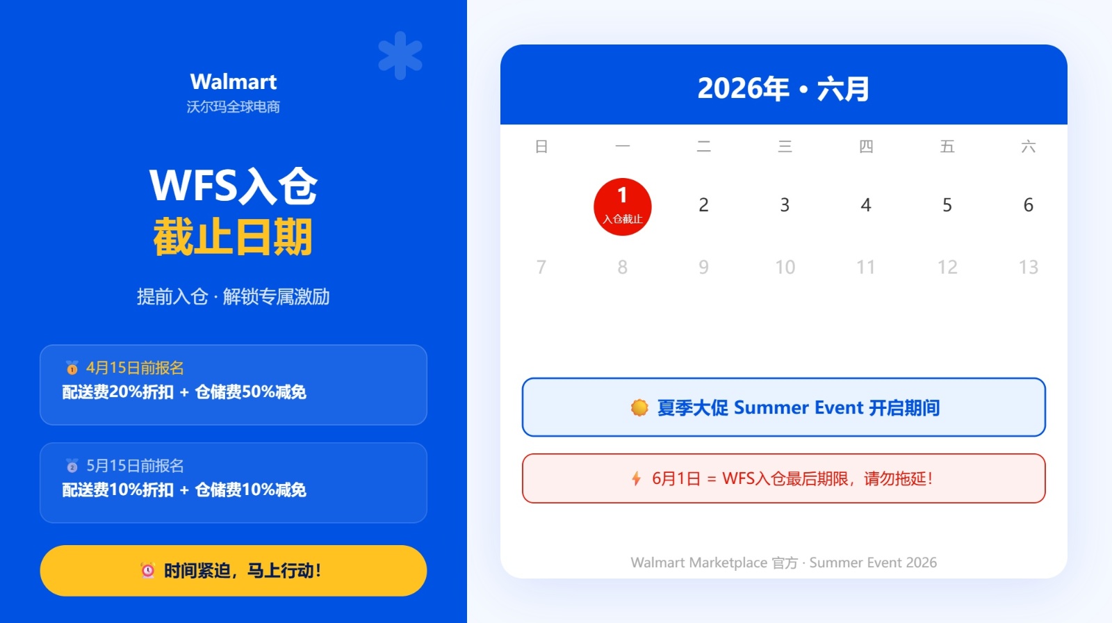 重要提醒:如果卖家提报活动的商品未能在2026年5月15日前完成官方审批,将无法享受本次夏季大促的WFS专属优惠!时间紧迫,请卖家尽快完成商品提报和入仓,以免错失折扣机会!