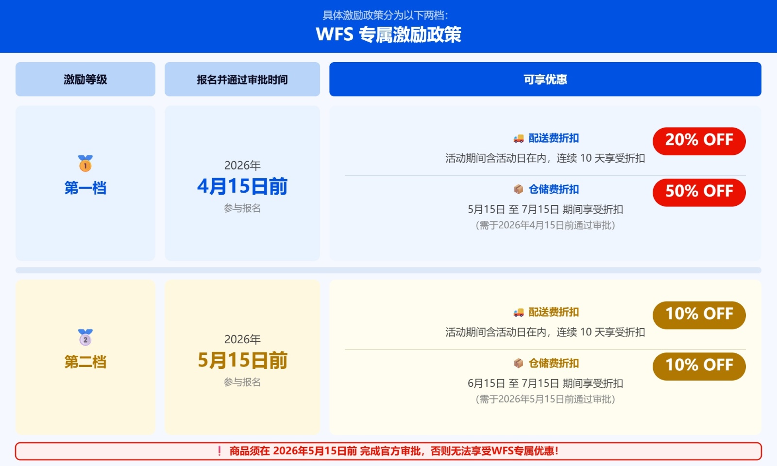 如果卖家的WFS商品在2026年5月15日前通过活动提报审批,并在2026年6月1日前完成WFS仓库入库 ,即可额外享受专属WFS激励!具体激励政策分为以下两档: