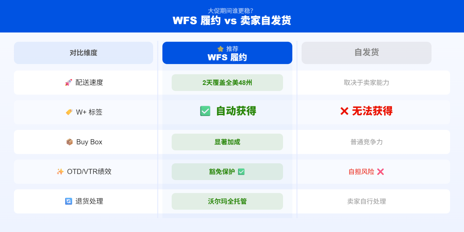 大促期间,快速履约更是直接影响转化率和Buy Box竞争力。提前备货至WFS仓库,是抢占速度优势的关键一步。