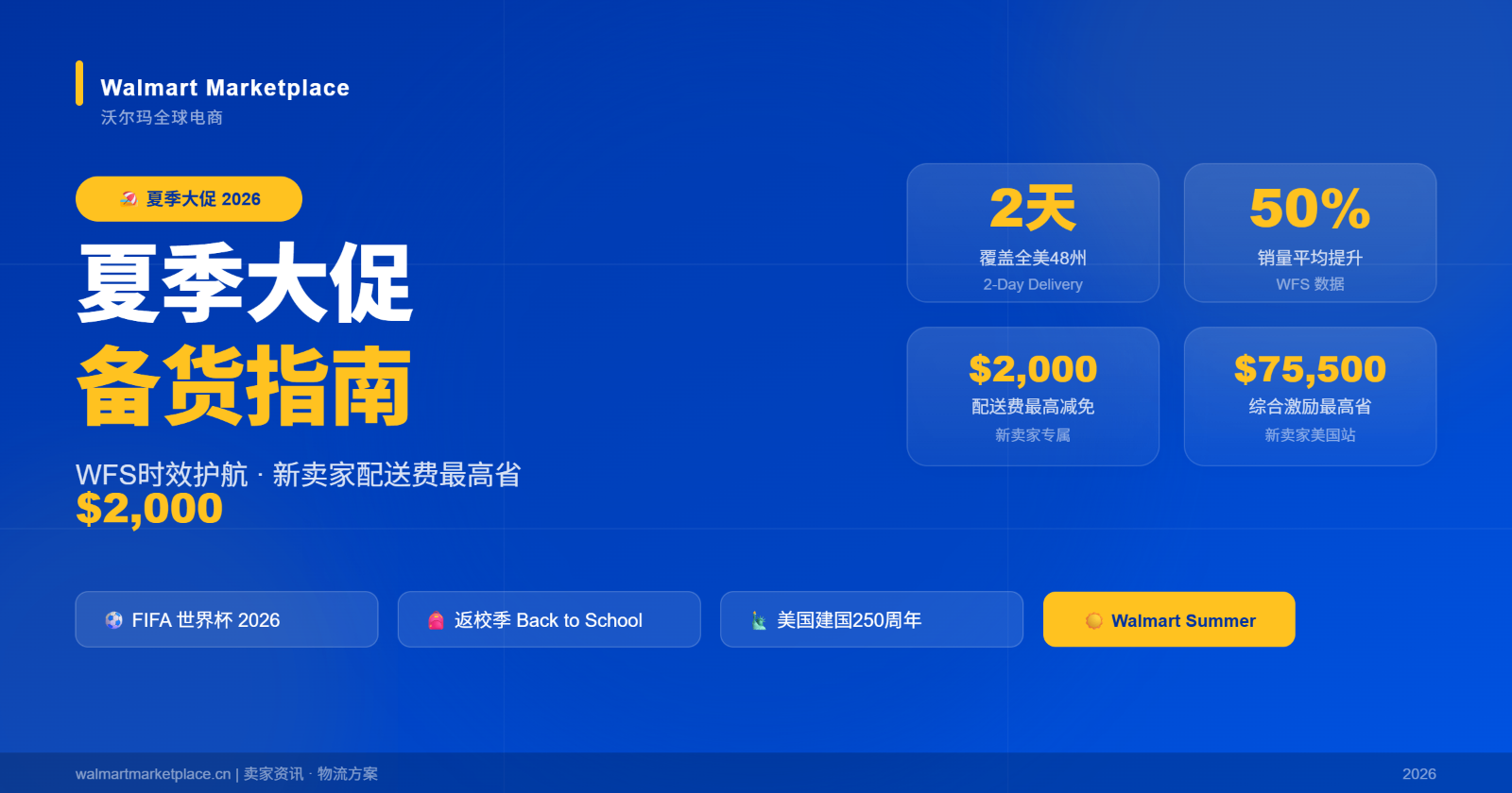 从 FIFA 世界杯到 Back to School 返校季,随着美国建国250周年庆典即将到来,将会迎来夏季首个重磅大促 Walmart Summer Event ,2026年夏季将是沃尔玛卖家冲刺业绩的黄金赛季。